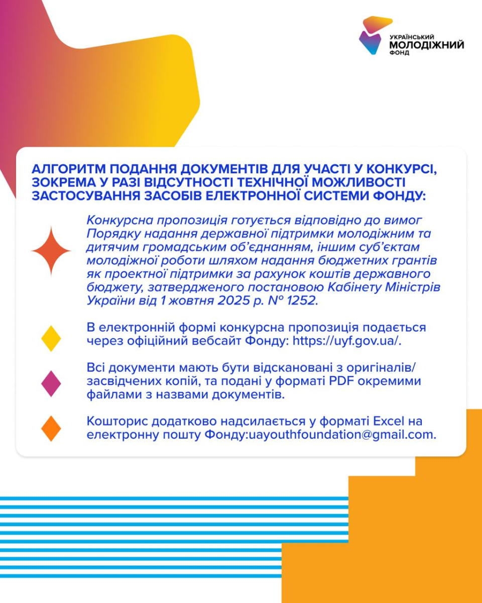 Документи – у PDF окремими файлами, кошторис додатково у Excel на електронну пошту Фонду.