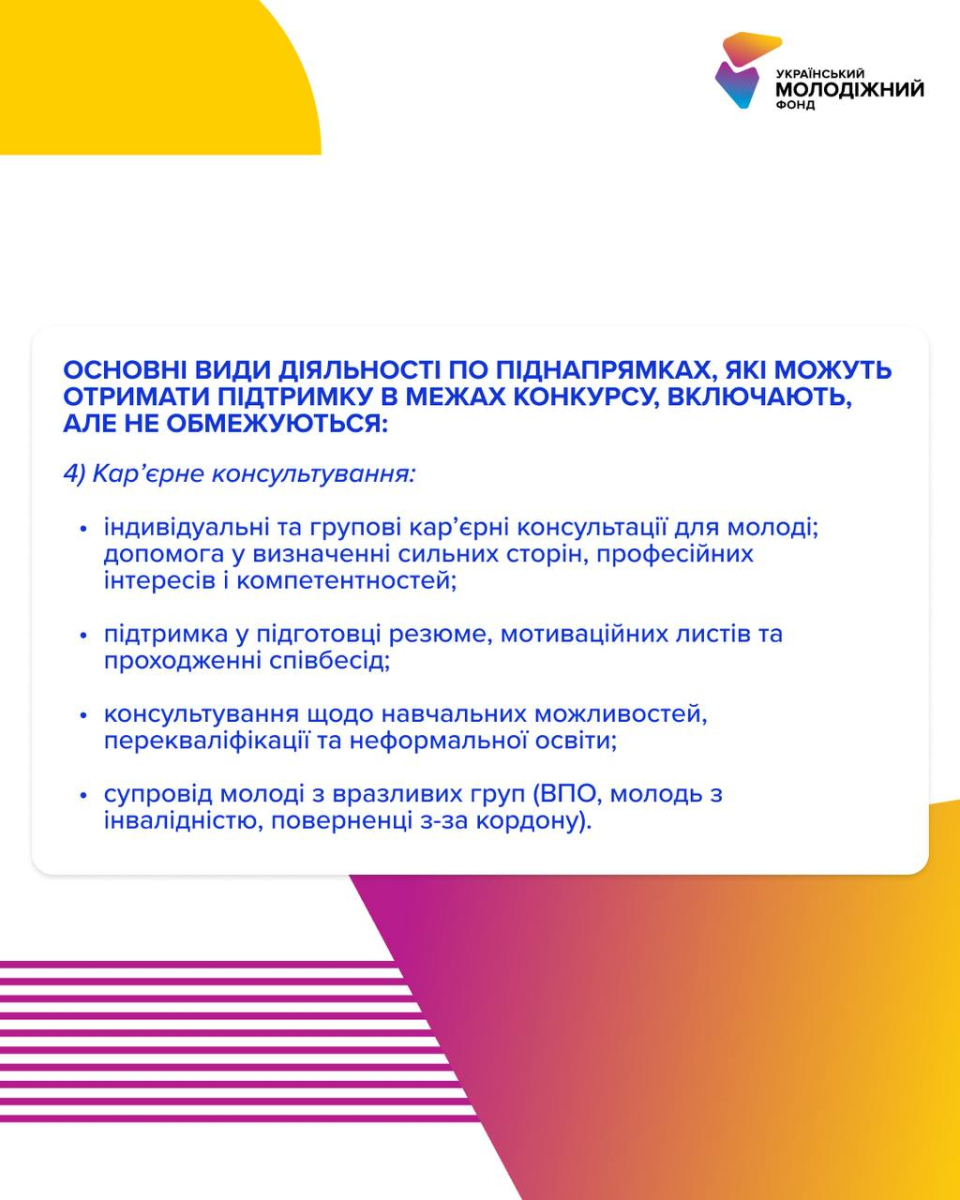 • кар’єрні консультації й підтримку молоді, яка потребує додаткових можливостей.